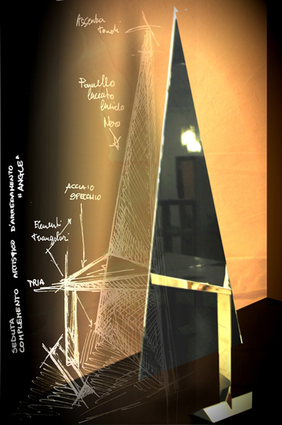 Seduta in acciaio lucidato a specchio e legno laccato nero, realizzazione per azienda “Praminox” prototipo per esposizione