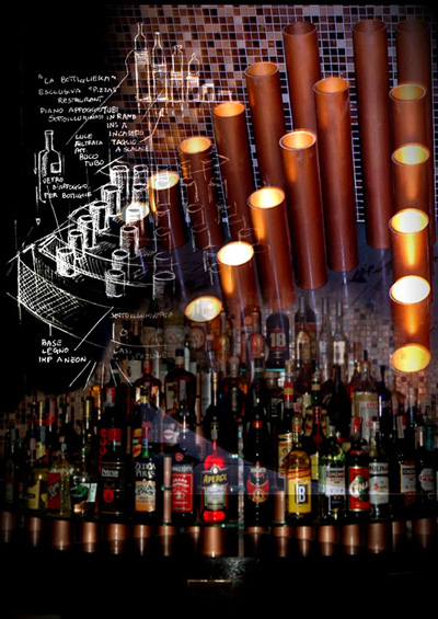 Bottigliera espositiva Tubolare di rame a scalare e vetro. Illuminazione sottostante a tubi di neon Passante. Realizzazione su commissione