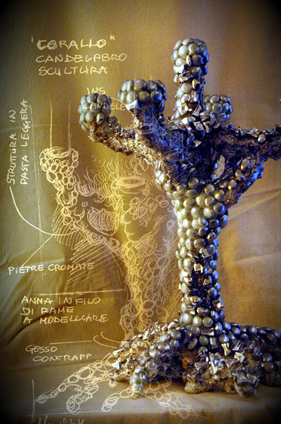 Candelabro scultura, gesso su supporto In fili di rame argentato e pietre di vetro Prototipo su ordinazione