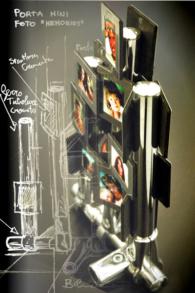 Espositore fotografico da tavolo, ferro cromato, lamiera spazzolata, legno e calamite.
