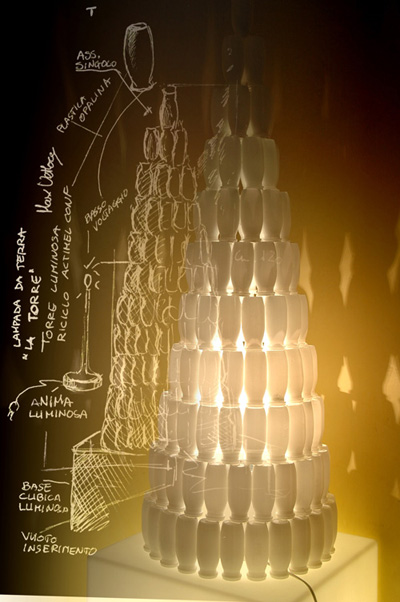 Lampada da terra in plastica riciclata, vasetti di yogurt da bere, biancati ed elettrosaldati. Prototipo per esposizione